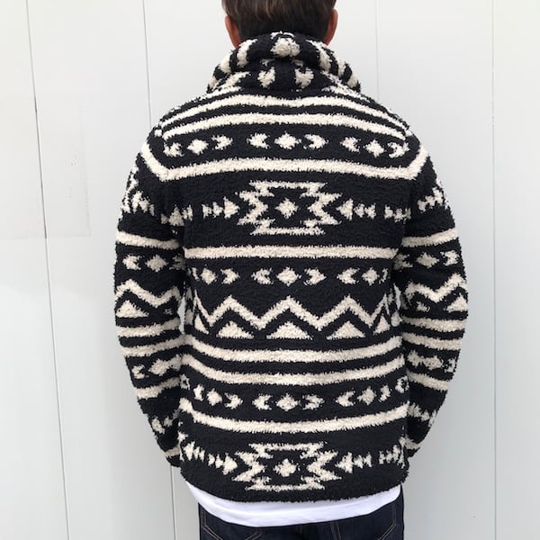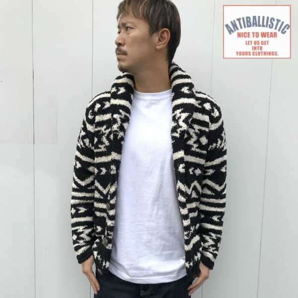 【ANTIBALLISTIC】モコモコショールカラー ニット ネイティブ柄 【ブラック・黒/ホワイト・白】