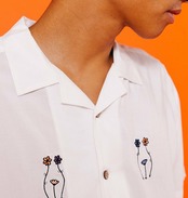 両胸に花柄の刺繍をあしらい、シンプルながら雰囲気のある一着。